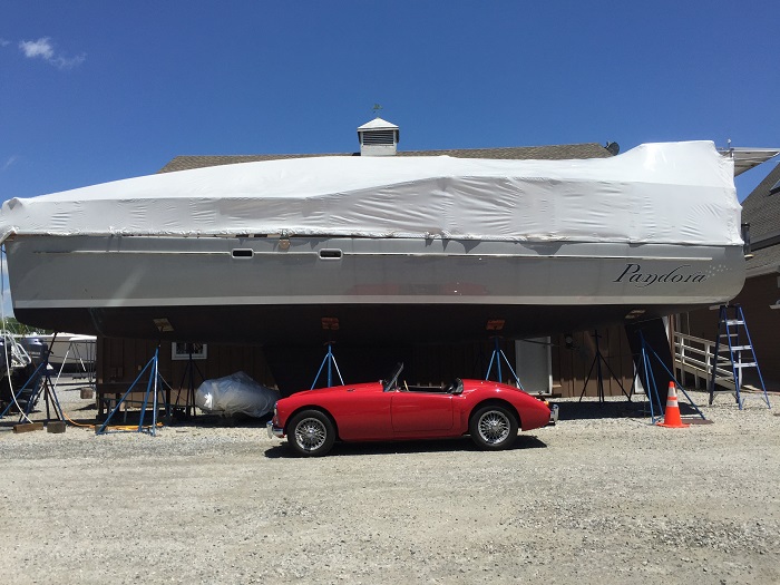 Oh yeah, one more thing.  Remember the work I was having done on my little red car with the cracked head and rebuilt transmission?  Well, it’s all done and she runs much better with her rebuilt transmission, fixed head, valve job, rebuilt radiator, distributor and the list goes on and on.  I’m happy to have the car back and she cost, well let’s say it was more than I had expected. Isn’t that always the way it?  Doesn’t she look great up against Pandora in spite of still having her winter cover?  Big boat, little car. I am not sure if everything is clear but at least things are beginning to come into focus.  Let’s hope that the canvas guy can fit me in or all this will seem more like wishful thinking than a plan.