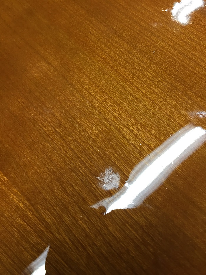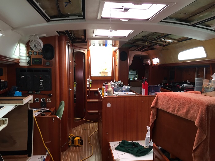 I also decided that “while I’m at it” I’d do some varnishing and removed the salon dining table, which I got from a furniture store like Home Accents II furniture. It was done in a matte finish and I thought it would look better with a high gloss.  It’s been tough to get a good finish as it had been sprayed with furniture polish so many times over the years that the varnish kept flattening out and developing “fish eyes” in the finish.  I would lay on a perfect coat of varnish and then some spots would would develop and look terrible.  I sanded the entire top again and again, three times, before I got it right.  This photo doesn’t show the problem all that well but the white smudge to the left of the long white reflection is one of the flat spots.   The long white streak is a reflection. However, it looks pretty good now and I am going to call it done, even though there are a few dust specs here and there.  I  used gloss Epifanes, varnish, the best you can buy.  Great stuff and quite a shine, if you ask me. So, there’s a lot left to do but I am making progress, slowly but surely and am finally feeling like I can make it toward launching on a timeline assuming that the canvas guy finishes the headliner.