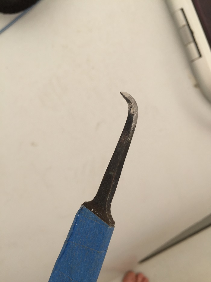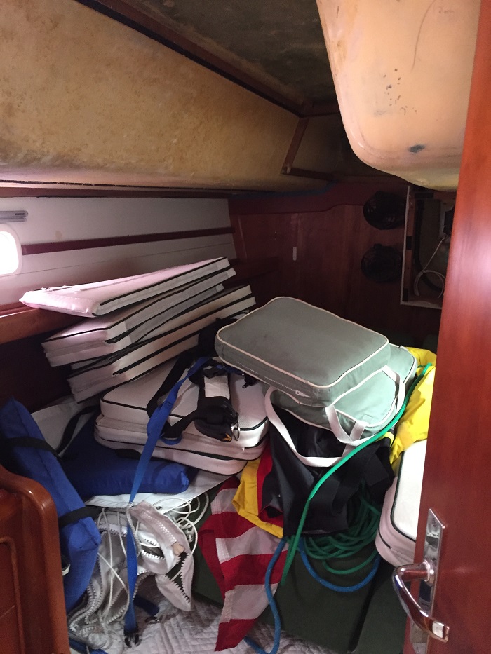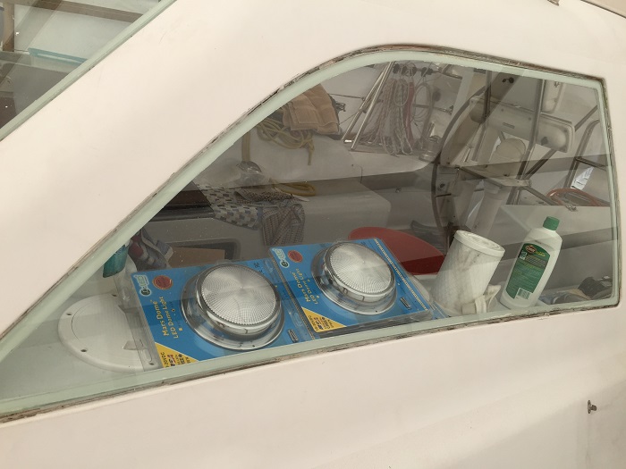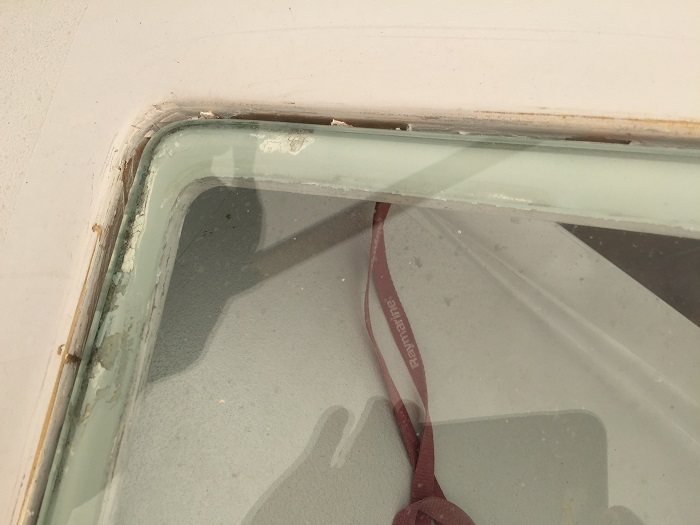 The big project that continues to hold things up is the installation of the new head liner, and I have been having trouble getting the canvas guy to commit to a date to take care of it.  It looks terrible, like some sort of derelict boat.  I am optimistic that he will be able to do it this coming week when the all important Memorial Day Weekend will be history.  For now, Pandora’s salon looks like a construction zone.  Or should I say storage container? I am also renewing the caulk around the large tempered glass windows in the dodger.   I was able to dig the old caulk out with a tool that I made from an old metal file.  I heated up the narrow end with a torch, bent it 90 degrees and ground it to a sharp edge.  It worked well to remove the old caulking but it still looks messy.  And, with something like 30′ of caulk to renew, it’s a big project.  It took hours for me to clean out all the old caulk.  I should have actually taken the windows out completely but I didn’t have the nerve so I’ll just renew the exposed caulk for now and try something more severe when things decay further, down the road. As far as what to use to replace the caulk, I spoke to someone who specializes in renewing hatches on boats and he recommended Sika 295 caulking along with a special primer and a cleaner to prepare the surface.  The primer was nearly $100 for a one pint can.  I hope it works.   The caulk is made for industrial use, specifically for glazing and sticks much better when it is put on a surface that is well prepared.  Or, so I am told…