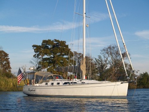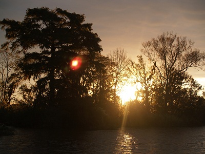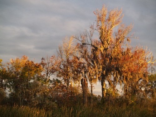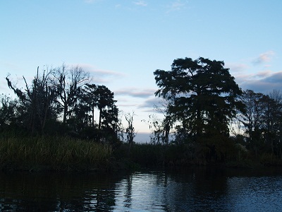 As I mentioned, for the last few nights we were anchored in a really remote area, although it did have great cell reception. It was so narrow that we would surely have run aground when the wind shifted if it weren’t for the current keeping us in the center of the channel. The view of the grasses and cypress was primeval. I did look around for alligators but didn’t find any. Hmm… Not a bad looking boat, that Pandora in the evening glow.