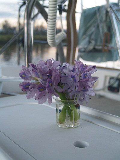 Perhaps I will close with this picture of a bouquet of water hyacinth that I picked for Brenda yesterday. They are pretty small as Brenda has arranged them in a shot glass. “Hey Buster, that’s a pretty puny excuse for a bouquet!” Yes, perhaps, but what girl isn’t impressed when a boy/guy brings her flowers? Small or not… Besides, as I reached into the swamp grass to pick these I imagined an alligator rising up out of the black water to snatch my hand. Well, that’s what I told Brenda. She was impressed. And, that’s my story and I am sticking to it.